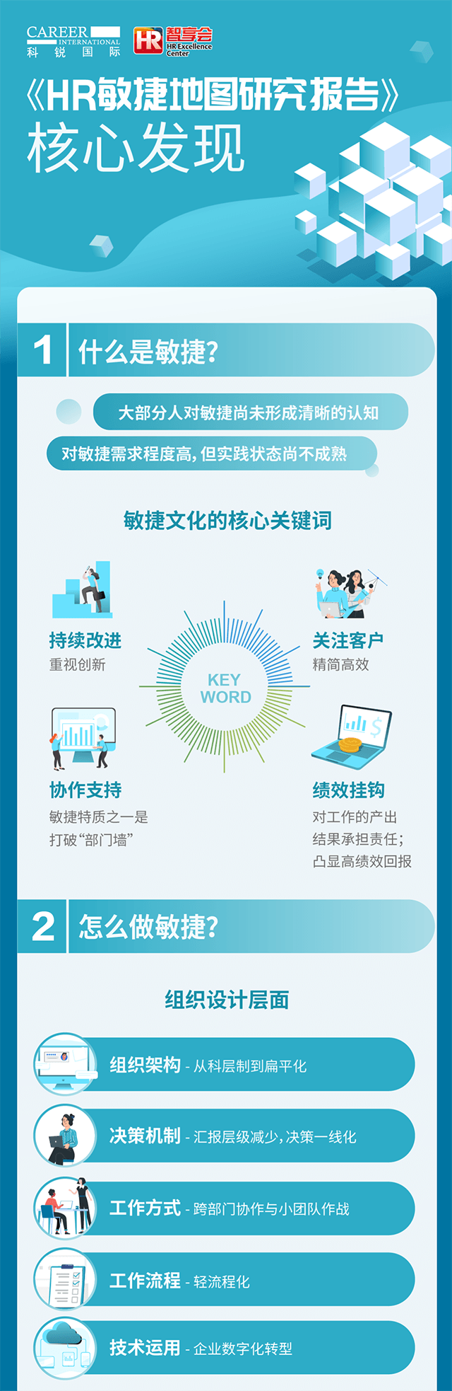 对于组织而言,有哪些工作方式、要素帮助组织敏捷起来?为了更好地助力组织的敏捷,人力资源团队做了哪些调整?为了探究以上问题,K8凯发国际国际人力资源公司联合智享会发起了“HR 敏捷地图”调研研究。问卷调研了三百余家企业,分析现在企业对“敏捷”概念的认知,和组织敏捷的现状。顺利获得深度采访十余位大型企业的人力资源一把手,探究组织敏捷实践场景以及人力资源在其中的助力之处,以及为了更好地助力组织敏捷人力资源团队自身在架构、能力等方面的调整。