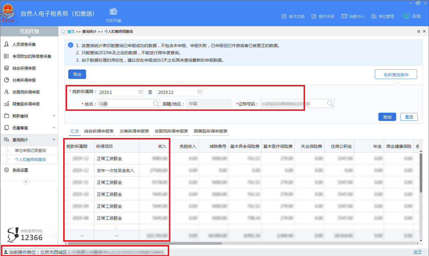 (2)2019年后单位版报税截屏。单位登录“自然人税收管理系统”,在代扣代缴项目栏的查询统计功能中点击个人扣缴明细查询(样例参见附件4 )